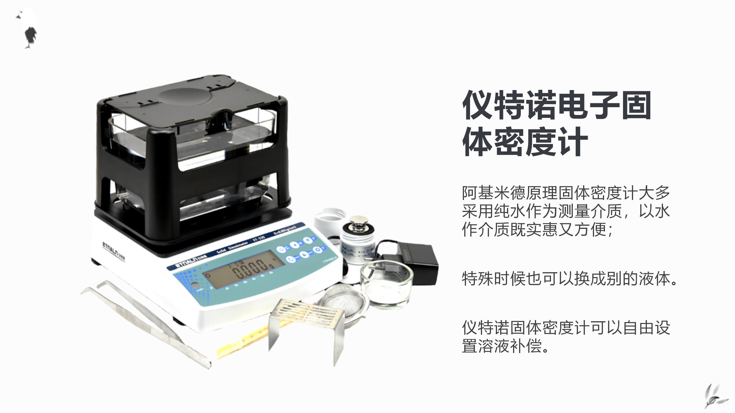 儀特諾固體密度計的其中一個亮點在于,它可以自由設置溶液補償,更換酒精、硅油等其它介質來進行測量,這一設計為要測試的產品會溶于水的用戶提供了極大的便利。