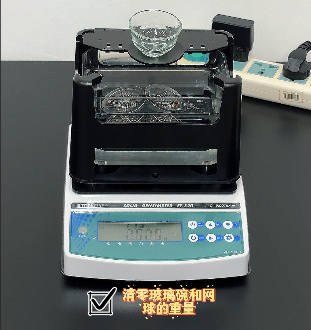 1、測量臺將網球置于水中的吊籃上,玻璃杯置于測量臺上,按【zero】鍵清零