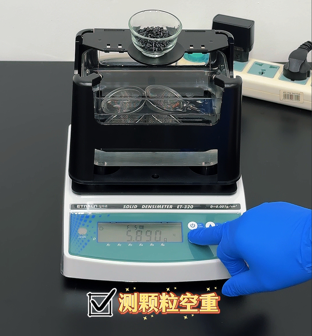 因為單個顆粒太輕,我們沒法只取一顆來測試,所以需要配套使用玻璃碗和網球(儀器標準配置里都有含有測顆粒的配件、測浮體配件)。