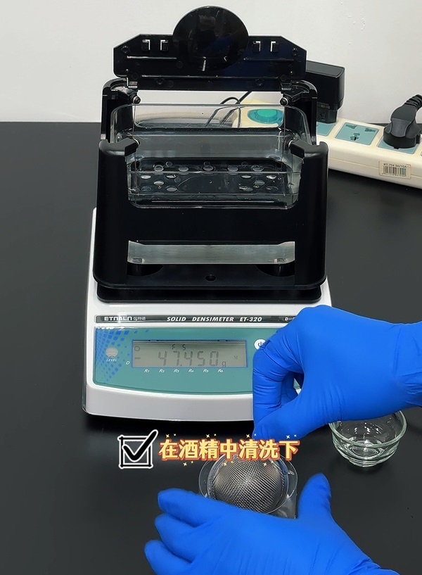 3、將盛有顆粒樣品的玻璃碗取下來,將水中測量臺上的網球拿出來,并把樣品倒入到網球中扣上網球,這時候需要注意樣品不能少,然后用手拿網球或鑷子夾起網球在事先準備好的酒精中清洗一下,稍微用力抖動確保顆粒間無氣泡。