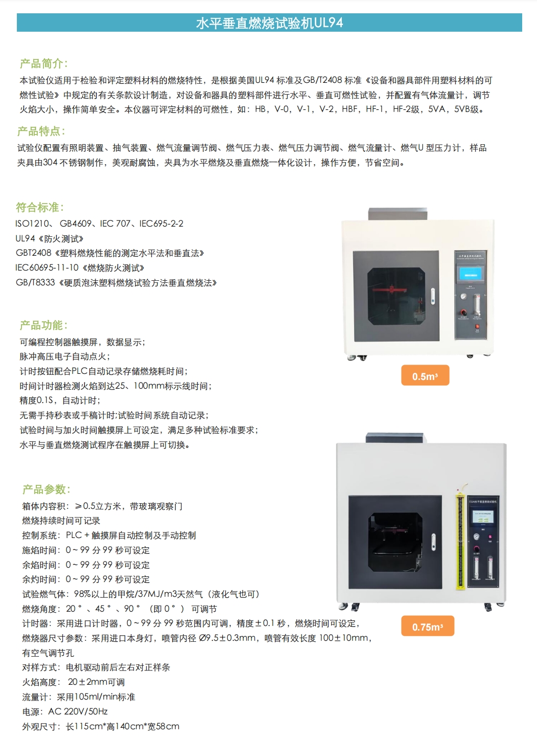 該設(shè)備用于測(cè)試材料的HB、V-0、5VA等阻燃等級(jí),火焰功率分50W和500W兩種,通過(guò)調(diào)節(jié)火焰高度實(shí)現(xiàn)。改進(jìn)后的操作手柄可精準(zhǔn)控制火焰與試樣距離,適用于薄壁和溫度敏感材料,提升測(cè)試準(zhǔn)確性。