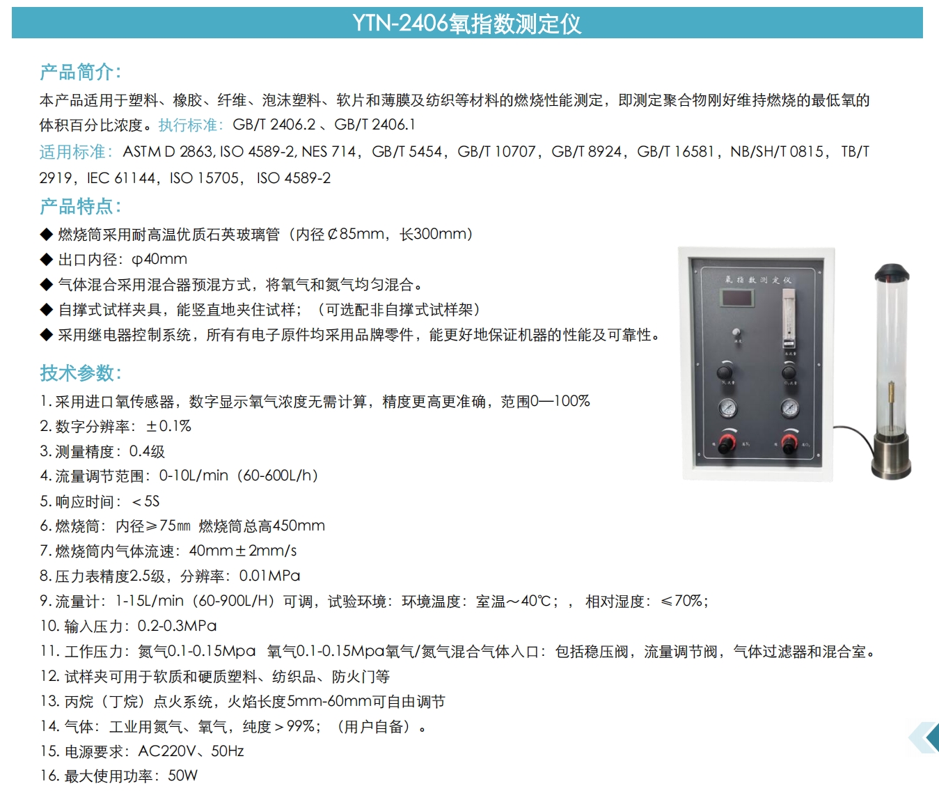 氧指數(shù)(OI值)是衡量材料阻燃性能的重要指標(biāo),氧指數(shù)測(cè)定儀通過(guò)測(cè)量材料燃燒所需的最低氧濃度,為阻燃材料研發(fā)提供數(shù)據(jù)支持。