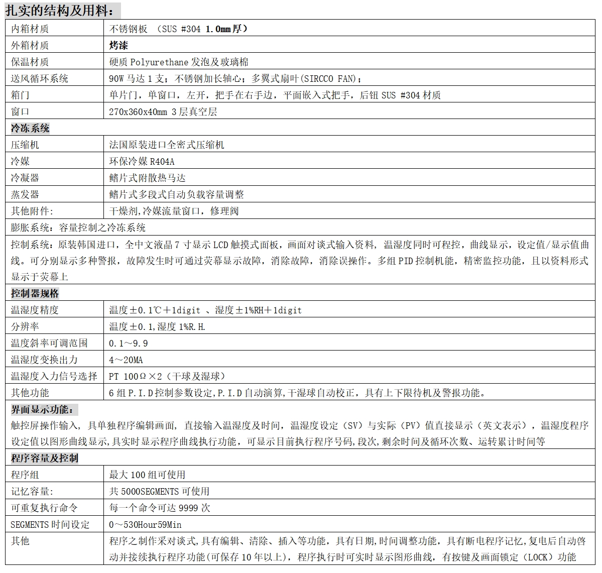 電源線4.0 mm2x3蕊;USB導(dǎo)出端子一個(gè);不銹鋼SUS #304方型沖孔鋼板置物架2片;不銹鋼可調(diào)整間距40mm置物架軌道2組;11W節(jié)能照明窗口燈一支;機(jī)體左側(cè)ψ50mm測(cè)試孔1個(gè)(附不銹鋼孔蓋1只,硅膠塞頭1只);標(biāo)準(zhǔn)測(cè)試用不織布1片;控制器使用說(shuō)明書一套;操作說(shuō)明書一套。